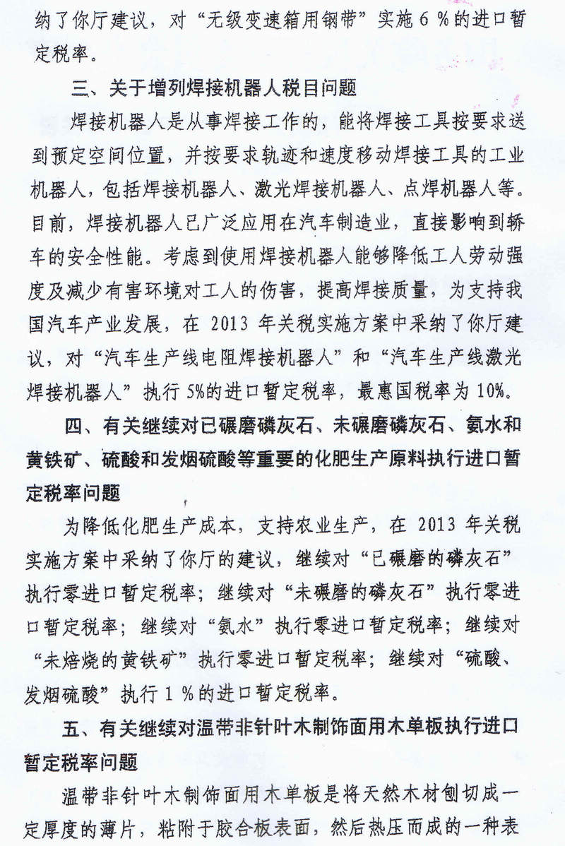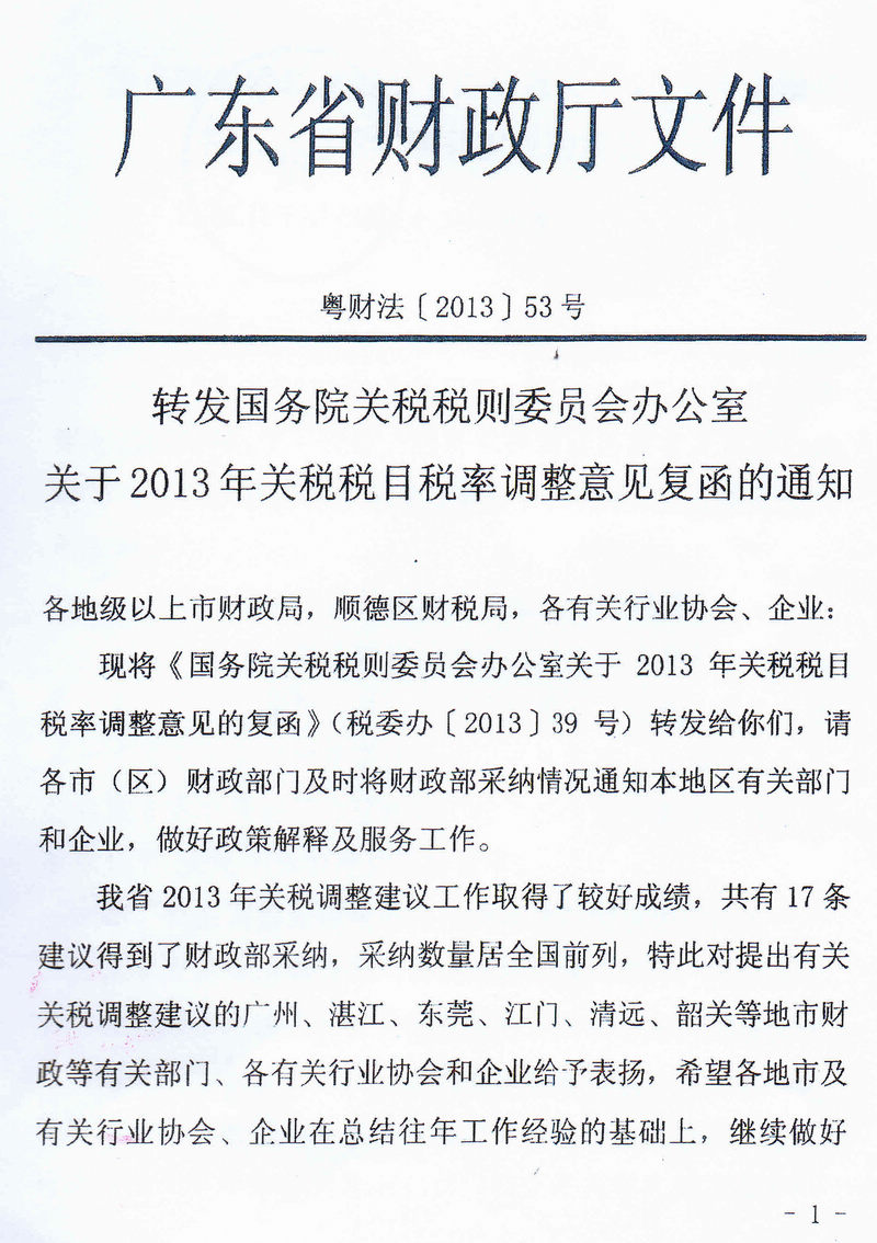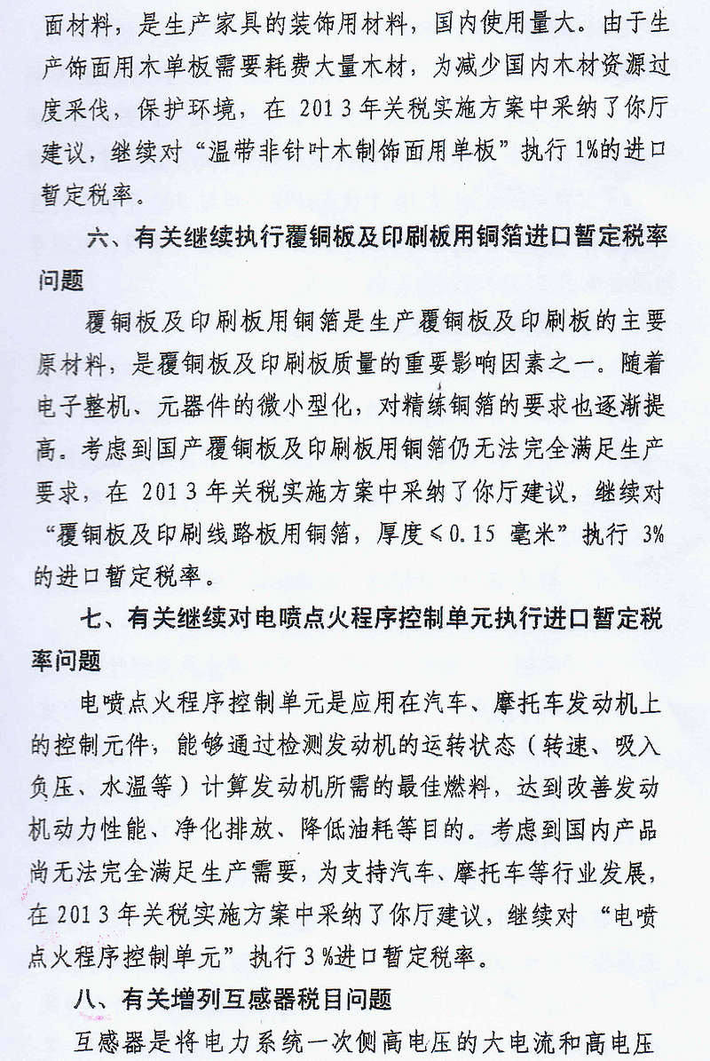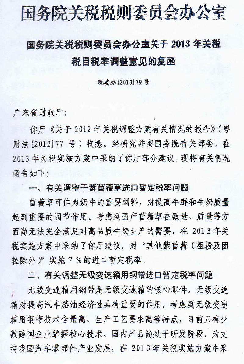 转发国务院关税税则委员会办公室《关于2013年关税税目税率调整意见的复函》