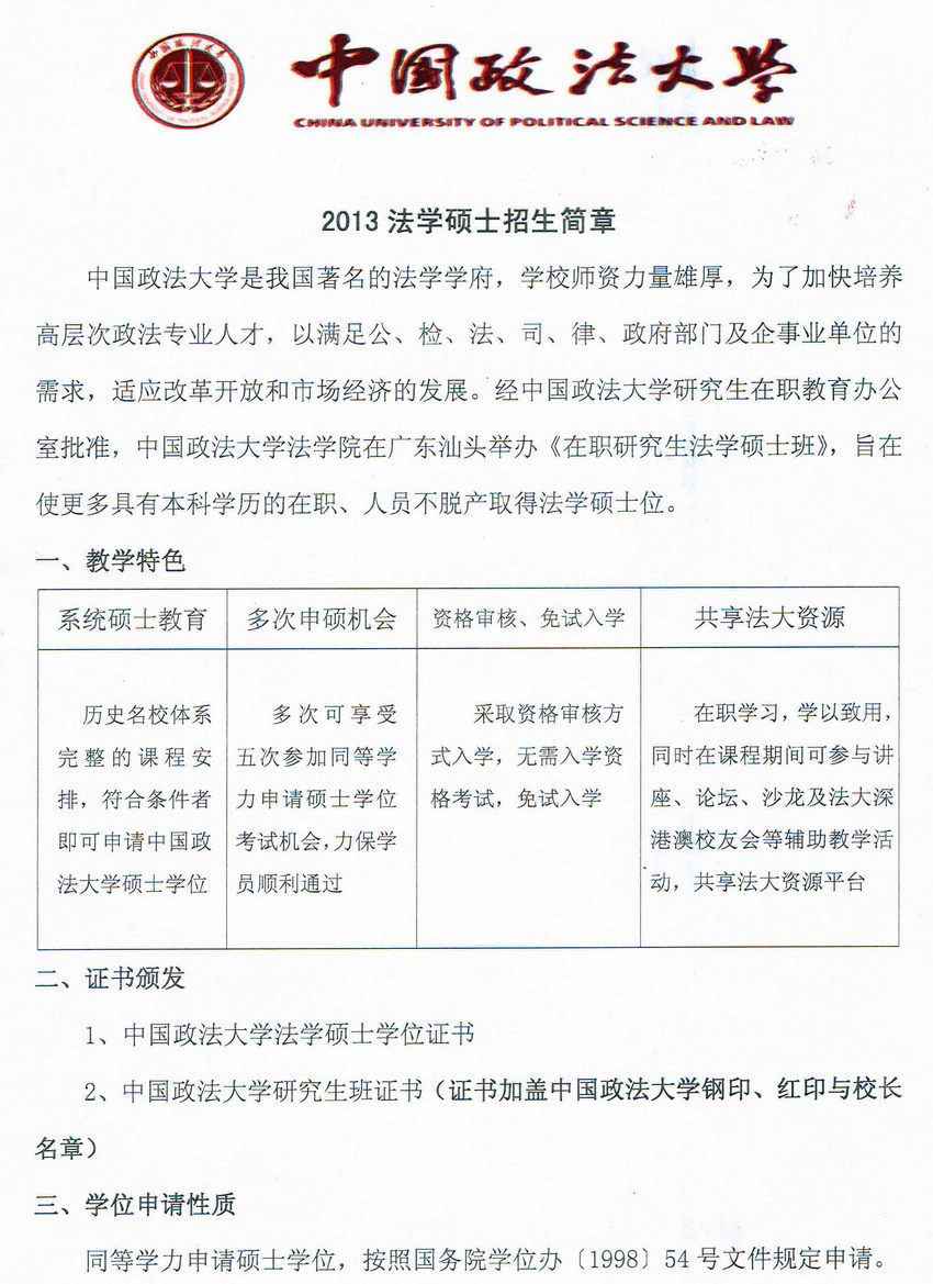 附件1: 2013年在职法学硕士研究生班报名申请表附件2: 中国政法大学——2013法学硕士汕头班招生通知
