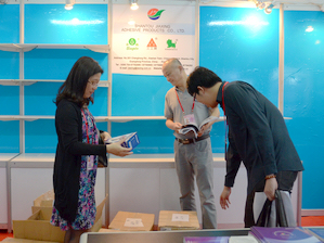 2014-4-15商会工作人员向我市参展企业派发二维码资料