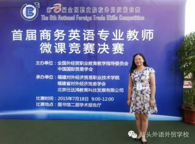 2015718日上午,首届全国商务英语专业教师微课竞赛现场决赛在福建对外经济职业技术学院学术报告厅举行。来自全国四所高职学院和三所中职学校的教师同台竞技,展示各自教学的亮点,我校蔡斯嘉老师以第四名的成绩获得首届全国商务英语专业教师微课竞赛二等奖。