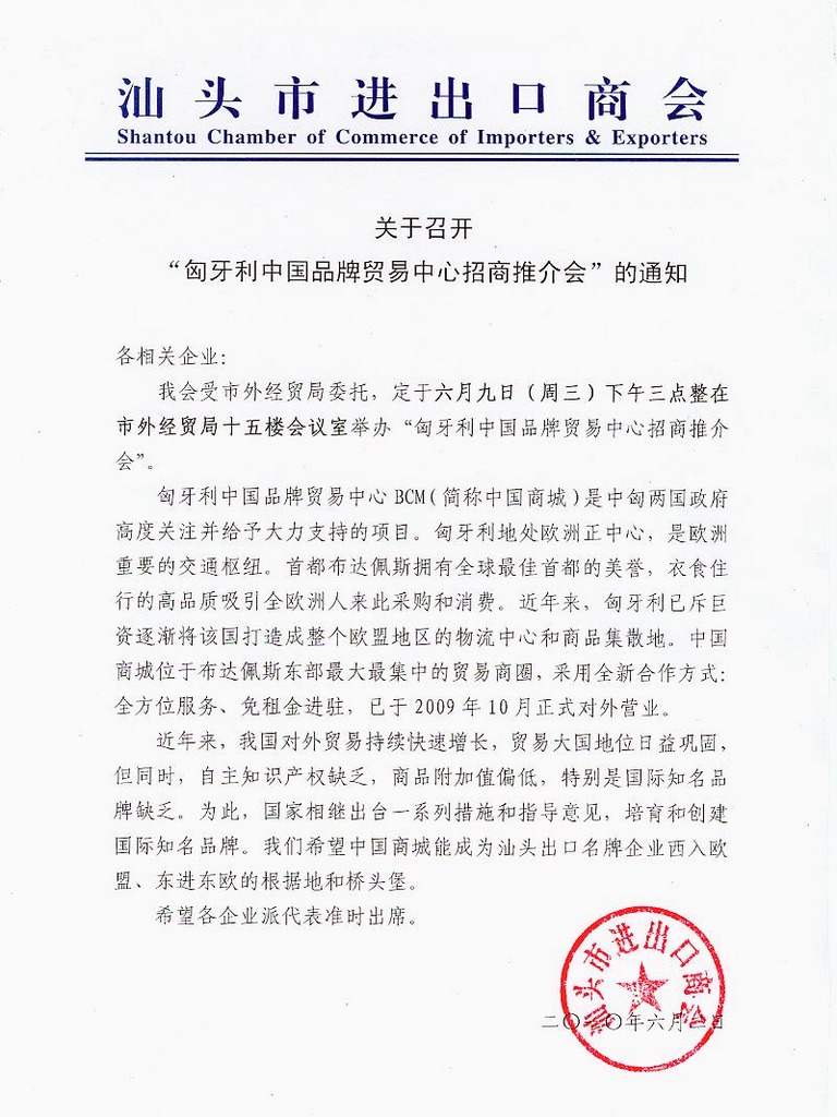 关于召开“匈牙利中国品牌贸易中心招商推介会”的通知