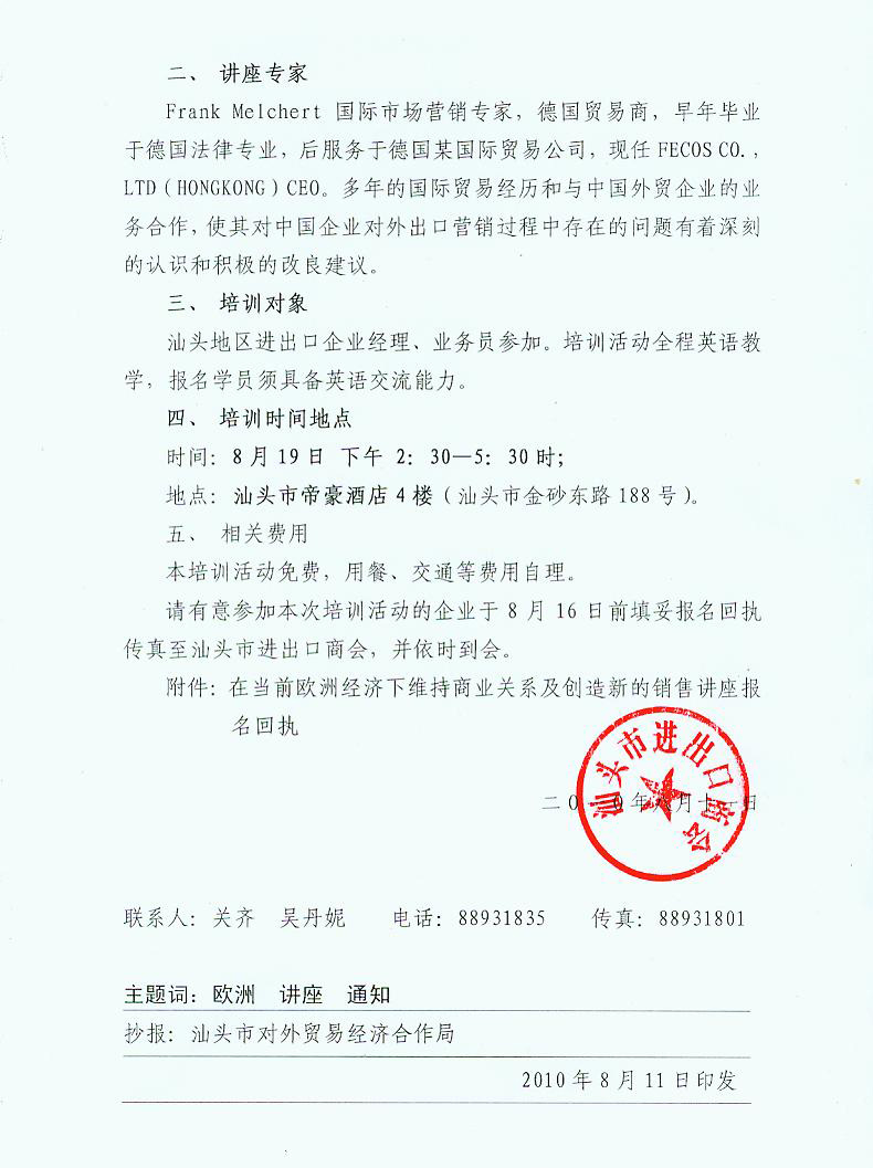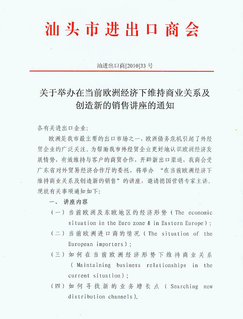 关于举办在当前欧洲经济下维持商业关系及创造新的销售讲座的通知