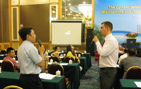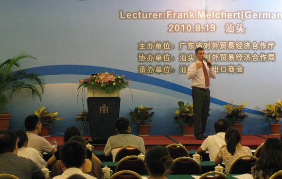 2010年8月19日,由广东省外经贸厅主办、汕头市外经贸局协办、汕头市进出口商会承办的“在当前欧洲经济下维持商业关系及创造新的销售”培训讲座,在汕头市帝豪酒店举办。省外经贸厅张鹏调研员出席讲座。讲座特邀具有多年外贸经验的德国营销专家Frank Melchert主讲授课,我市进出口企业200多名业务骨干参加,讲座主要介绍了欧洲当前的经济形势、中欧贸易合作环境及前景,同时就对外贸易沟通技巧和贸易往来中的注意事项进行分析,使企业营销人员进一步了解到维护双方贸易关系及创造新的商机的贸易沟通技巧。