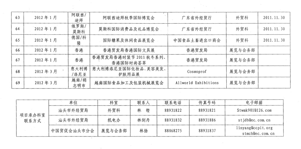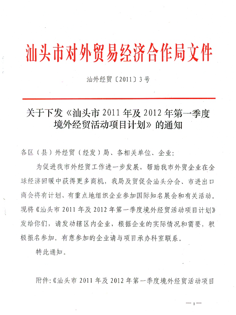 关于下发《汕头市2011年及2012年第一季度境外经贸活动项目计划》的通知
