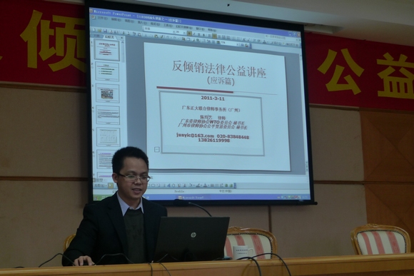 2011年3月11日,我会联合广东省商业联合会在市外经贸大厦15楼会议室举办了“WTO法律及反倾销法规公益讲座”,特邀广东正大联合律师事务所陈均艺律师到座主讲,我会刘漳荣会长、省商会联合会代表出席了本次讲座。讲座就反倾销基本知识;应诉及申诉程序和如何防范贸易风险做了详细的介绍,吸引了近百家关联企业代表前来参加。