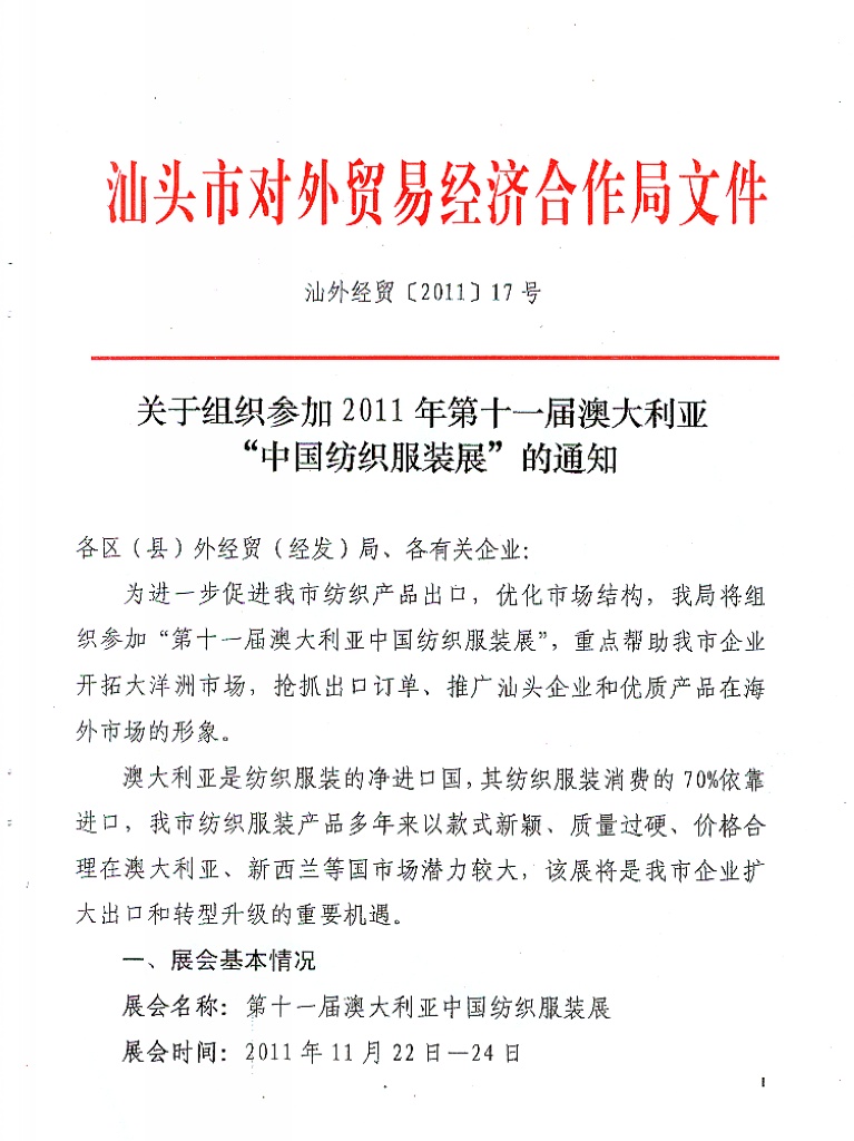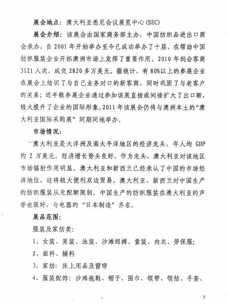 关于组织参加2011年第十一届澳大利亚“中国纺织服装展”的通知
