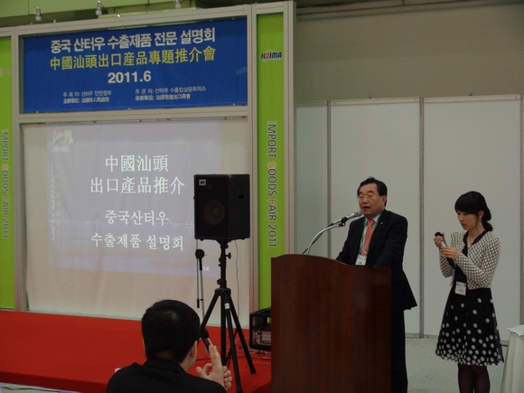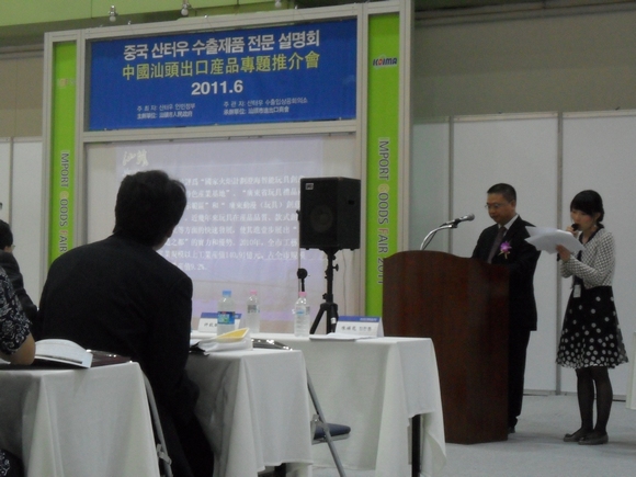 汕头市人民政府代表周汉钊、汕头市对外经济贸易合作局代表林乐群、韩国进口业协会分科委员会联合长李丙昭出席汕头出口产品推介会