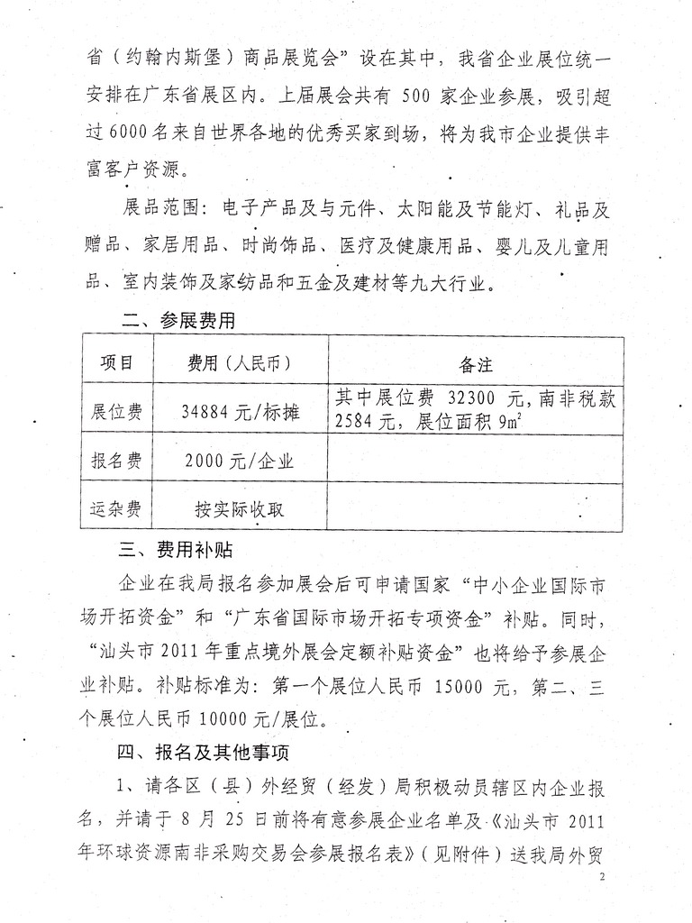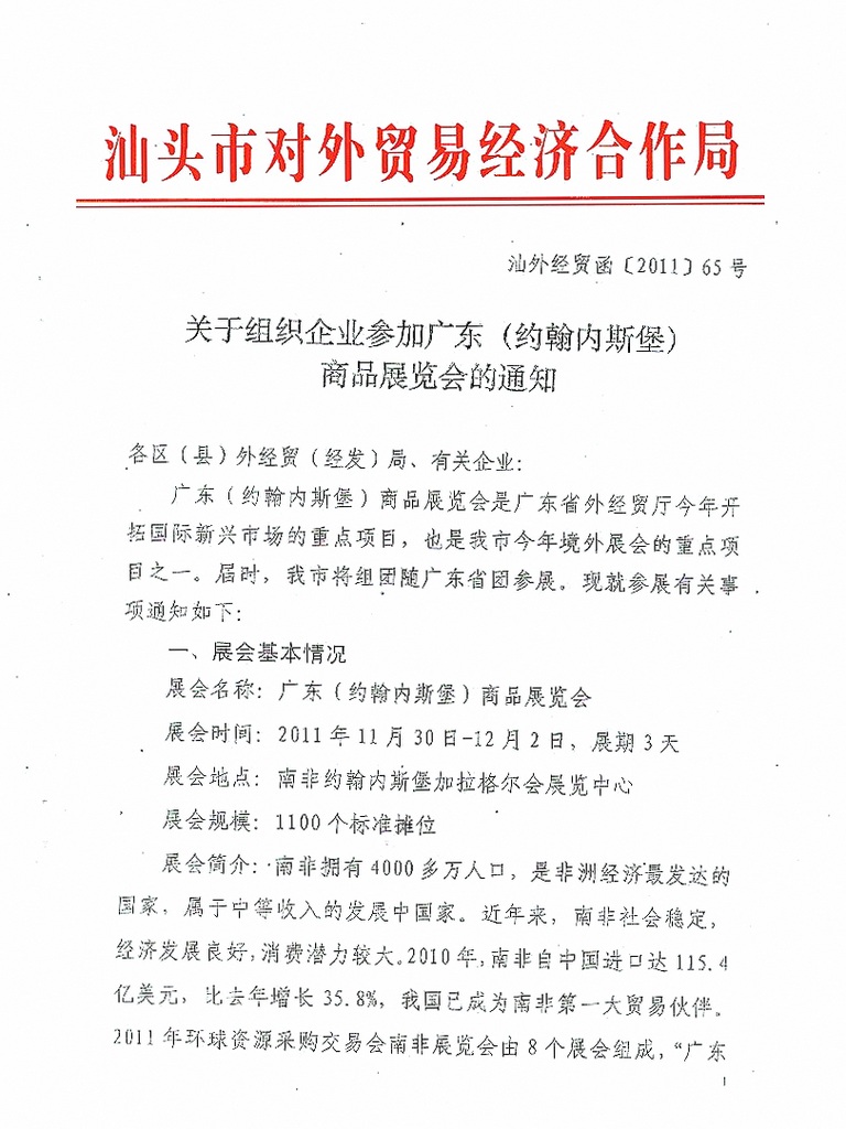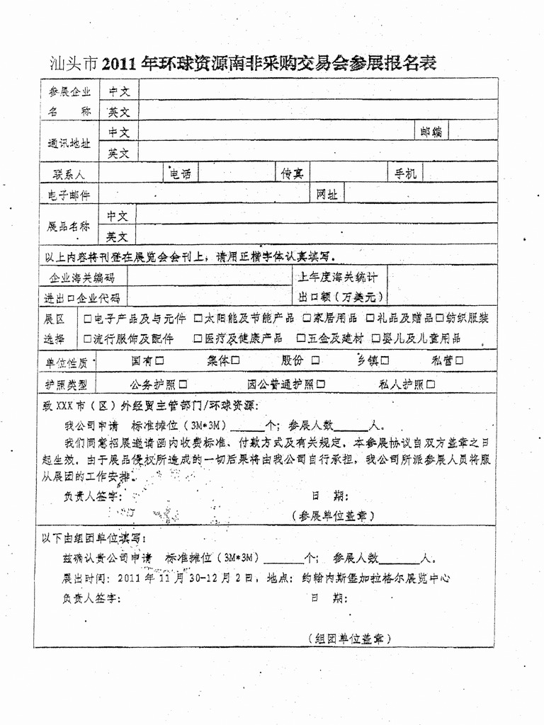 点击次数:1994    发布时间:2011-07-15  附件:汕头市2011年环球资源南非采购交易会参展报名表.doc