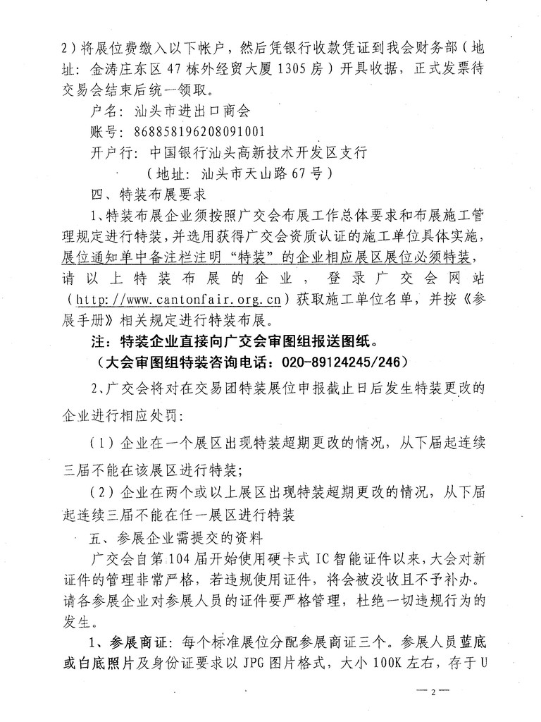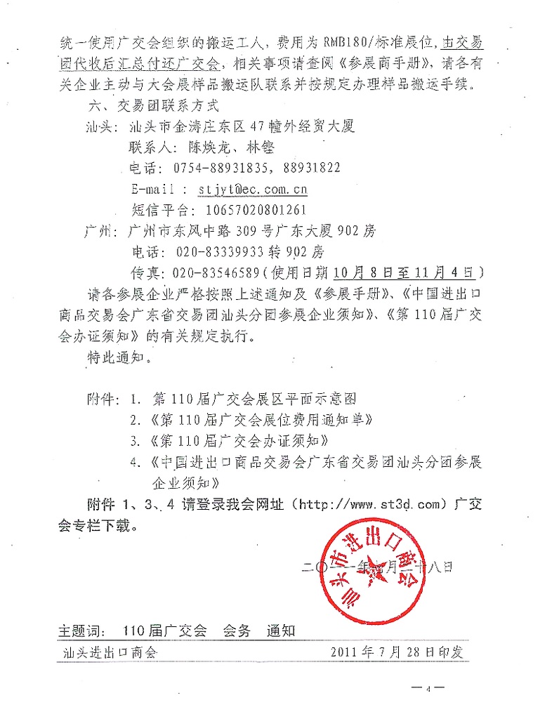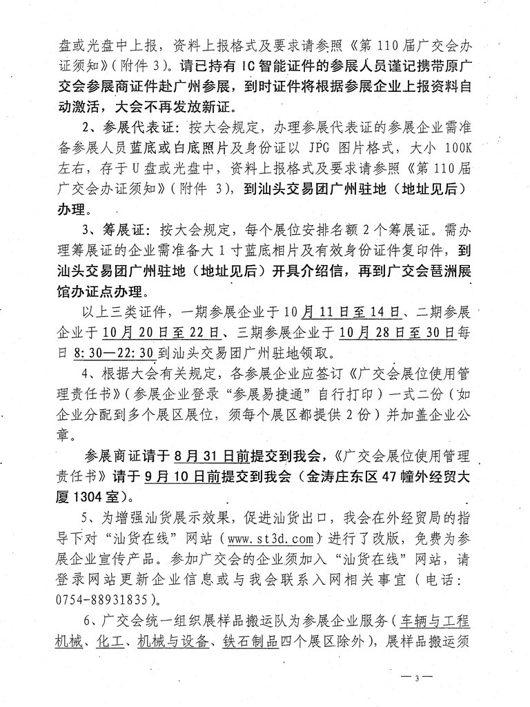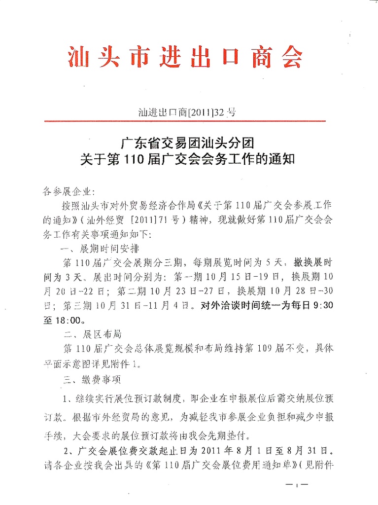 广东省交易团汕头分团关于第110届广交会会务工作的通知