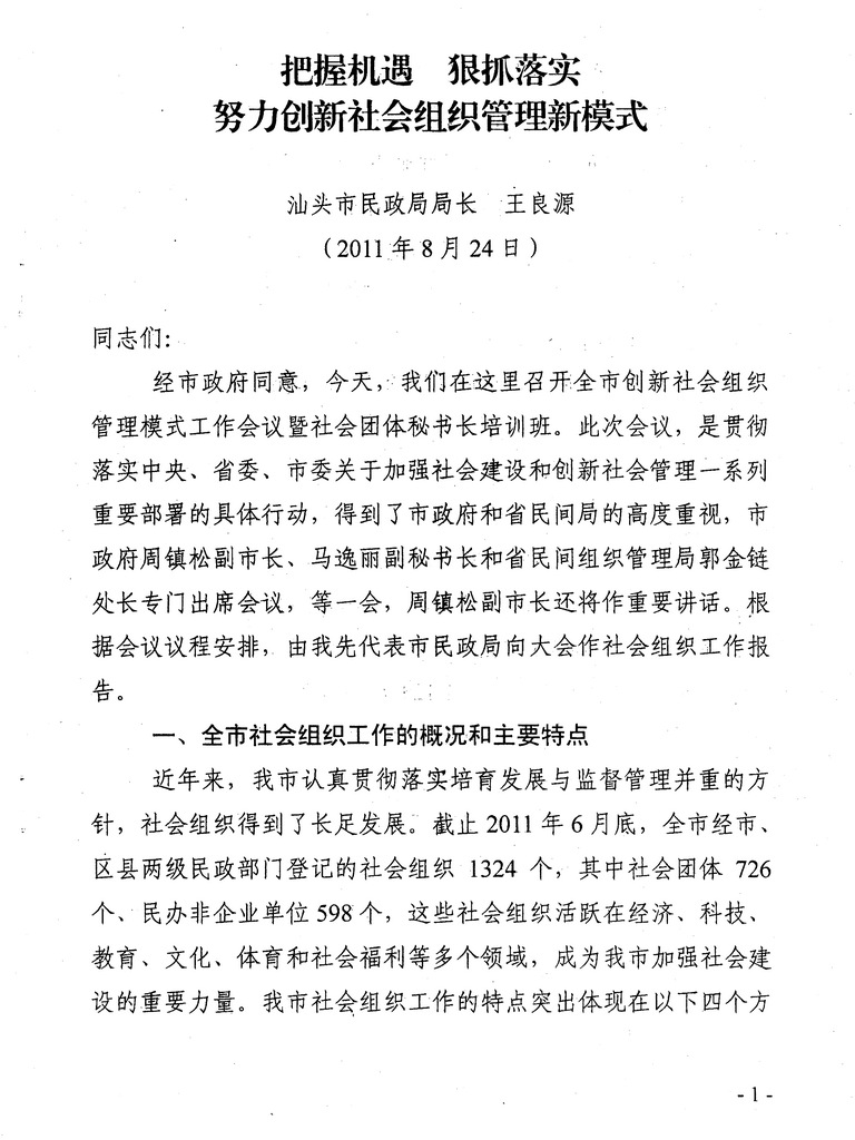 转发汕头市民政局王良源局长讲话——把握机遇,狠抓落实,努力创新社会组织管理新模式