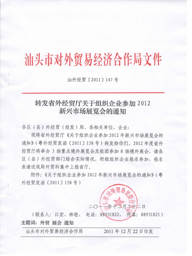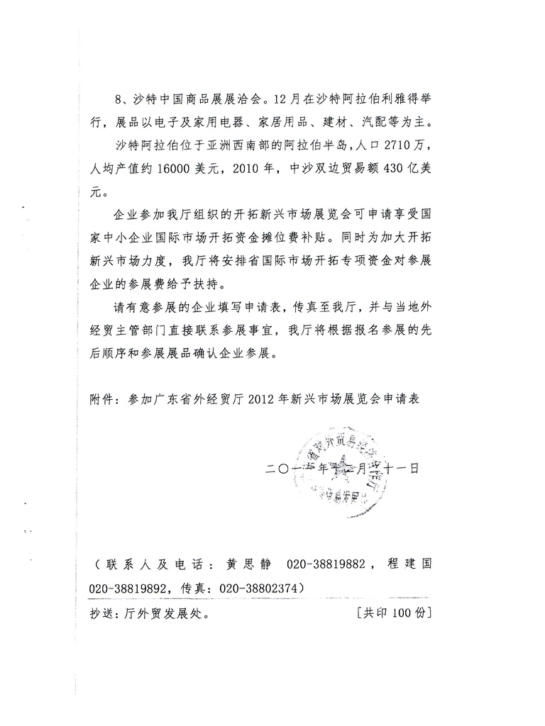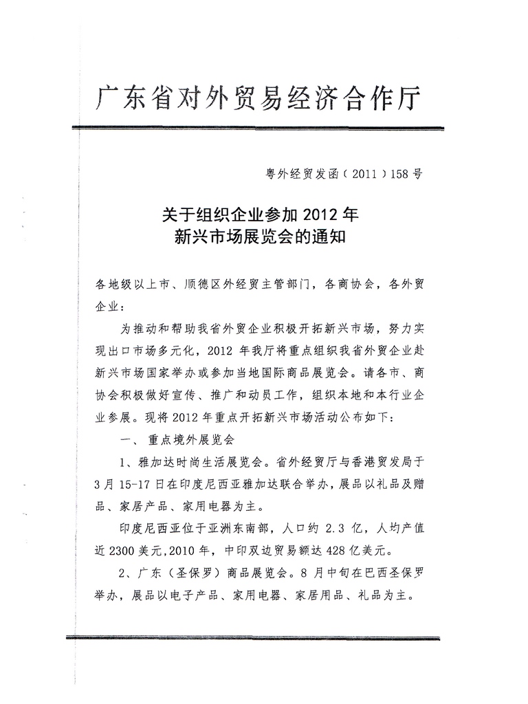 点击次数:2517    发布时间:2011-12-23  附件:参加广东省外经贸厅2012年新兴市场展览会申请表.jpg
