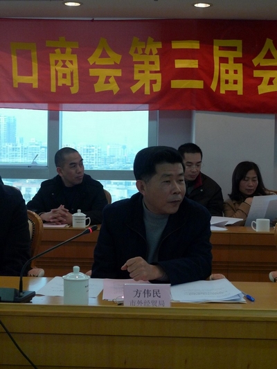 市民间组织管理局胡进辉副局长、市外经贸局方伟民副局长、陈跃夫主任科员应邀出席了会议。会上,市民间组织管理局胡进辉副局长充分肯定了我会这一年来的工作,并对我会今后的会费收缴工作提出了建议及要求。市外经贸局方伟民副局长分析了当前外经贸面临的严峻形势,指出企业应提高风险应对能力和创新能力,以商会为纽带,群策群力,为我市的外贸发展作贡献。