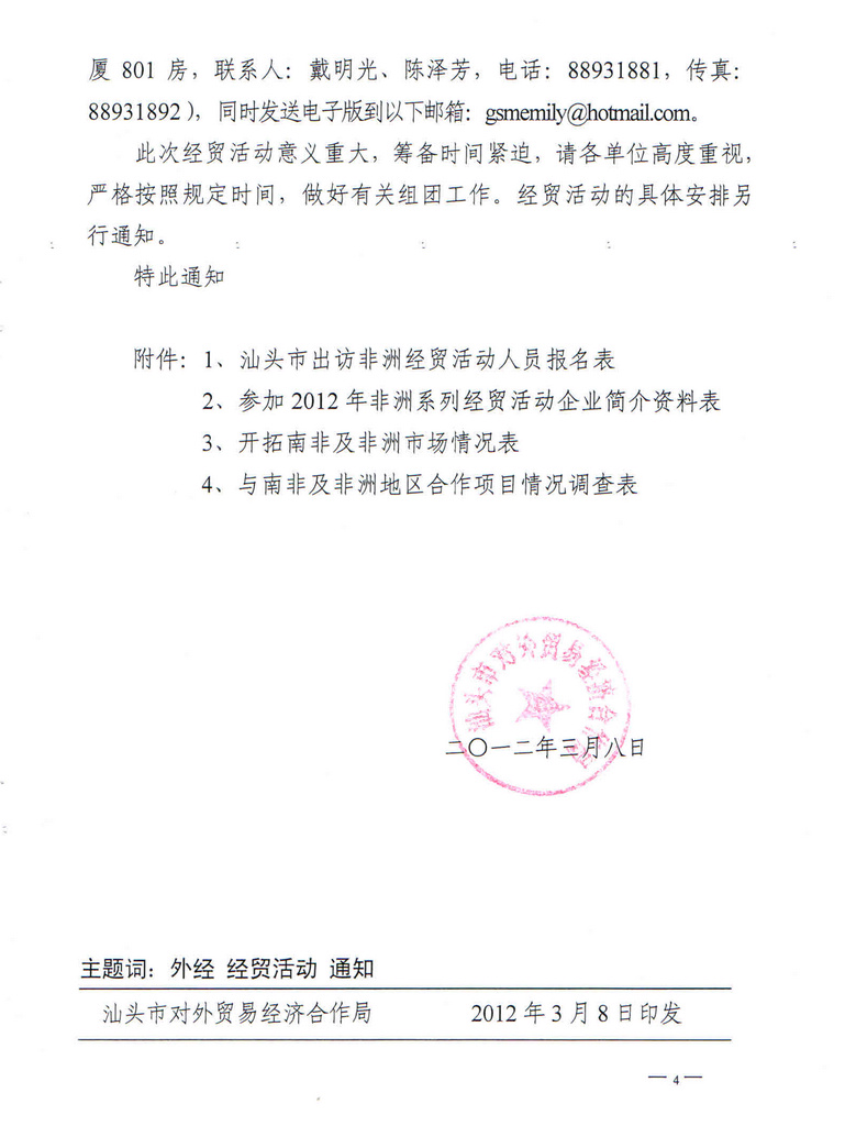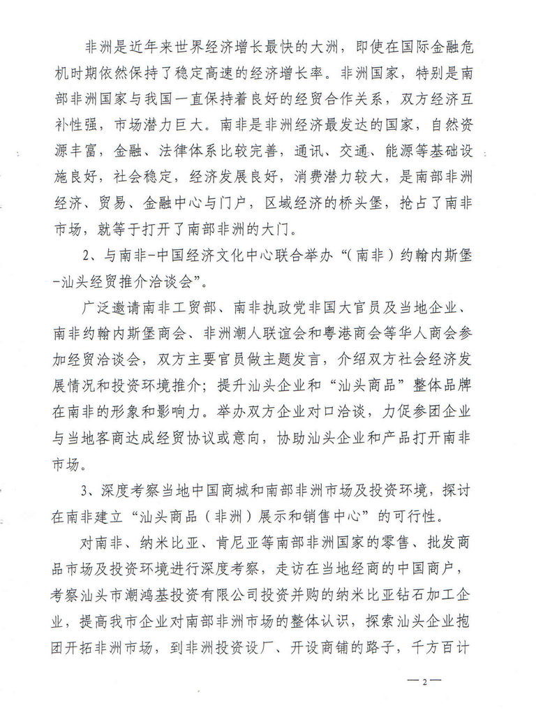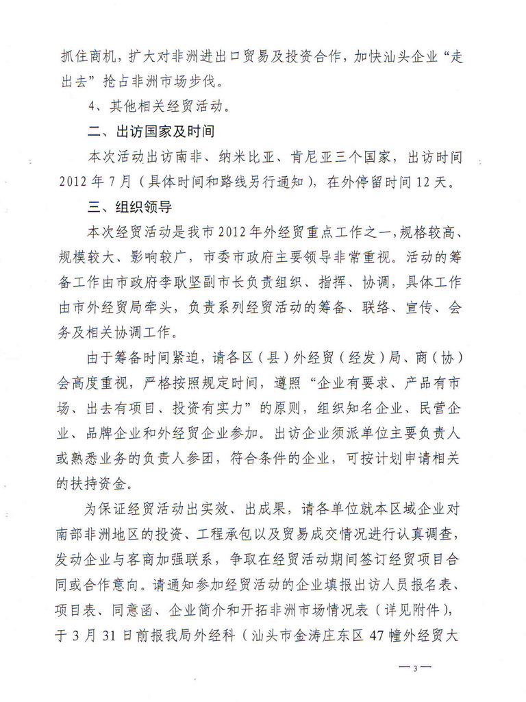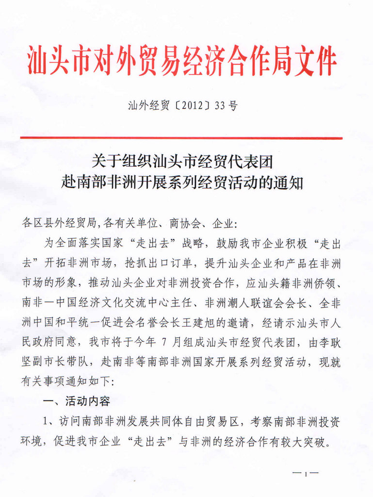 关于组织汕头市经贸代表团赴南部非洲开展系列经贸活动的通知