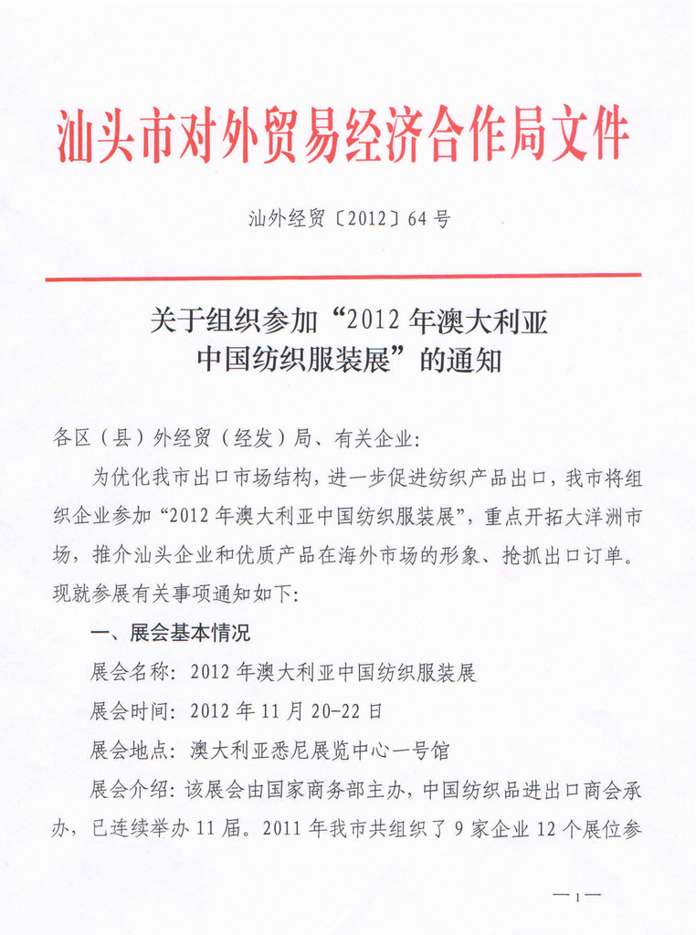 关于组织参加“2012年澳大利亚中国纺织服装展"的通知