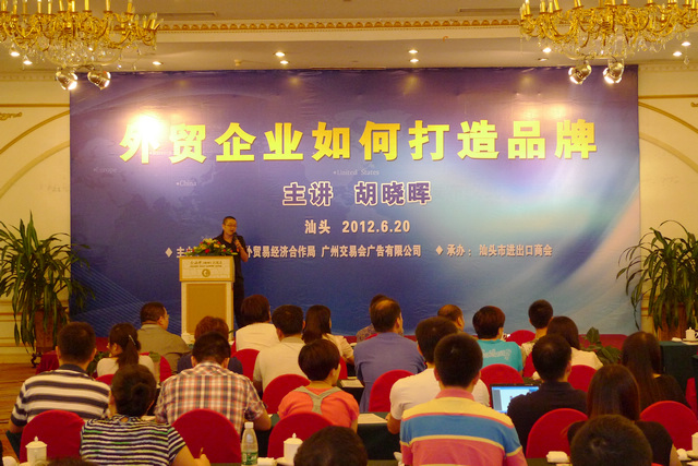 6月20日下午,由市外经贸局主办,市进出口商会承办的“外贸企业如何打造品牌”培训讲座于汕头市金海湾大酒店举办,本次培训讲座特邀中国对外贸易中心品牌策略总监胡晓晖莅汕授课。市外经贸局外贸科科长陈秀聪主持讲座,市外经贸局副局长方伟民、广州交易会广告有限公司总经理傅郁芬、商会会长刘漳荣出席了讲座。