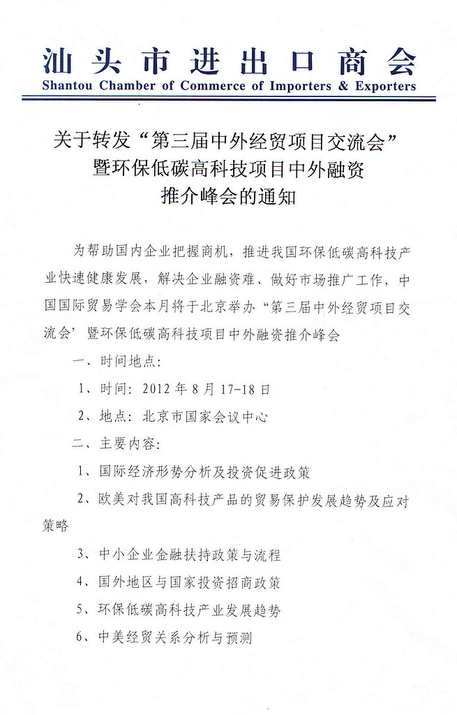 关于转发“第三届中外经贸项目交流会”暨环保低碳高科技项目中外融资推介峰会的通知