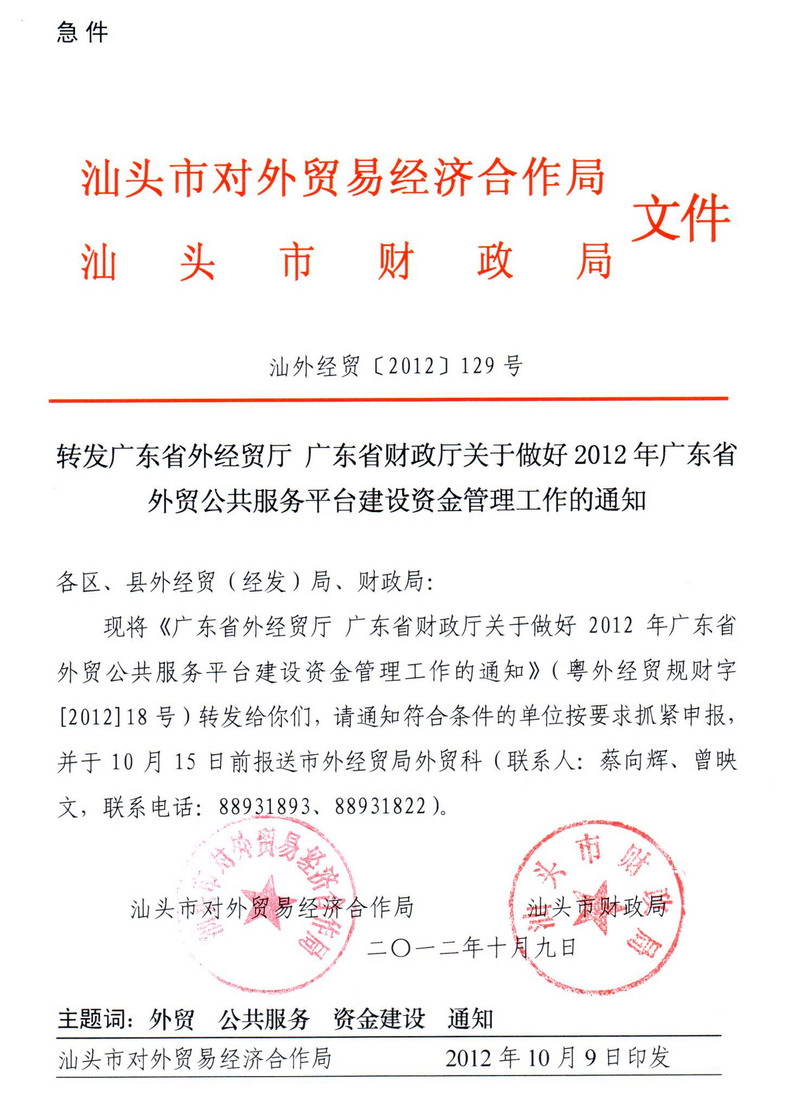 转发《省外经贸厅 省财政厅关于做好2012年广东省外贸公共服务平台建设资金管理工作的通知》