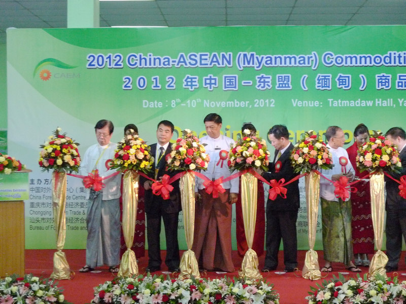 11月8日,2012年中国-东盟(缅甸)商品博览会在仰光军事博物馆开幕。中国驻缅甸大使馆经济商务参赞金洪根、缅甸仰光省工业及能源部部长吴年吞吴等中缅双方领导嘉宾出席开幕仪式。汕头市外经贸局外贸科陈秀聪科长和商会刘漳荣会长、黄益鹏副会长、周志鸿副会长等考察团成员也出席了开幕仪式。陈秀聪科长及刘漳荣会长应邀参加了剪彩并于开幕式后陪同嘉宾巡视展会。