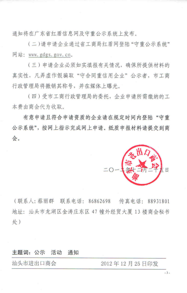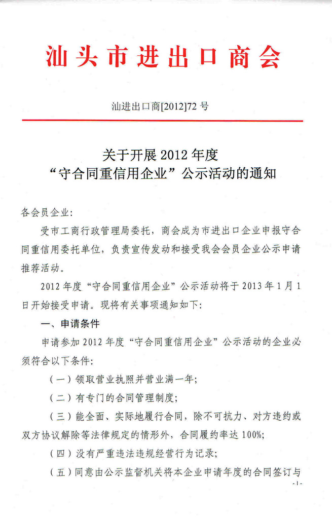 关于开展2012年度“守合同重信用企业”公示活动的通知