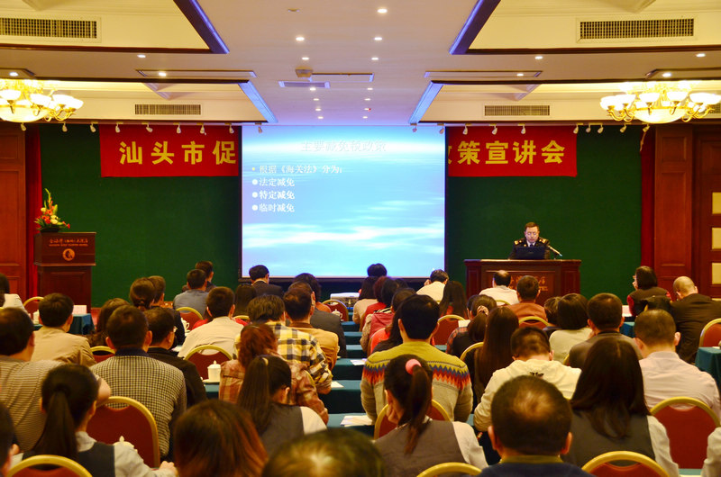 2013年3月13日,由汕头市外经贸局主办、汕头市进出口商会协办的“汕头市促进进口、减免税政策宣讲会”在汕头市金海湾大酒店黄金殿召开。市发改局、市经信局、市科技局、市财政局、市农业局、汕头大学及区县外经贸局代表出席了宣讲会。