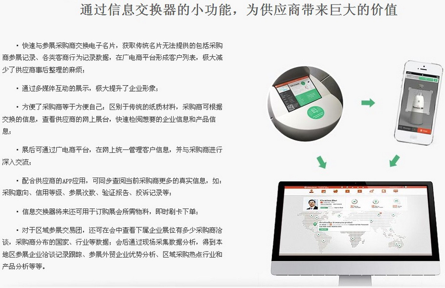 为方便广交会采购商和参展商相互交流,增加参展商与采购商的贸易成交机会,广交会中国对外贸易中心(集团)于今年7月组建广交会电子商务有限公司,并建设广交会电子商务平台(下称“广电商平台”)。汕头交易团作为广电商平台的电子商务服务试点之一,第113届广交会第一期参展企业可免费体验广电商平台的电子商务服务,根据《指引手册》操作“信息交换器”,与采购商进行贸易信息交流。