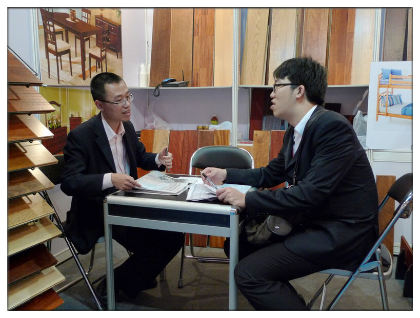 汕头市欣源木塑实业有限公司业务人员向外国客商详细介绍该司的环保产品