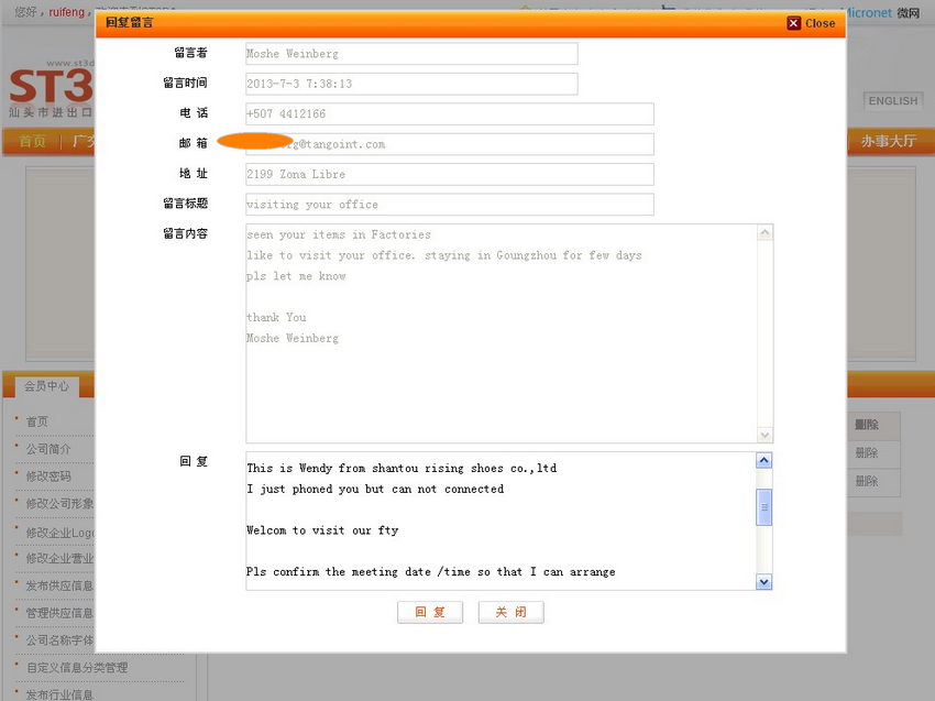 7月3日,南美洲巴拿马客商通过商会ST3D网站留言给出口企业“汕头市瑞峰贸易有限公司”,表示将于近日来华,并在广州逗留几天,希望能联系上瑞峰公司并前往参观。商会工作人员第一时间告知瑞峰公司业务负责人,双方取得了联系并正在努力建立长期合作关系。