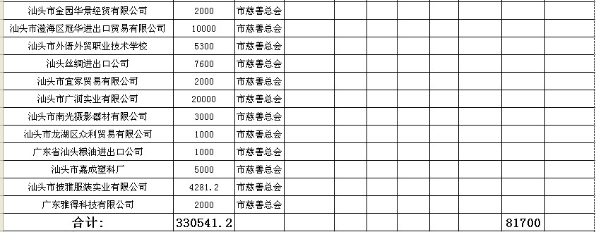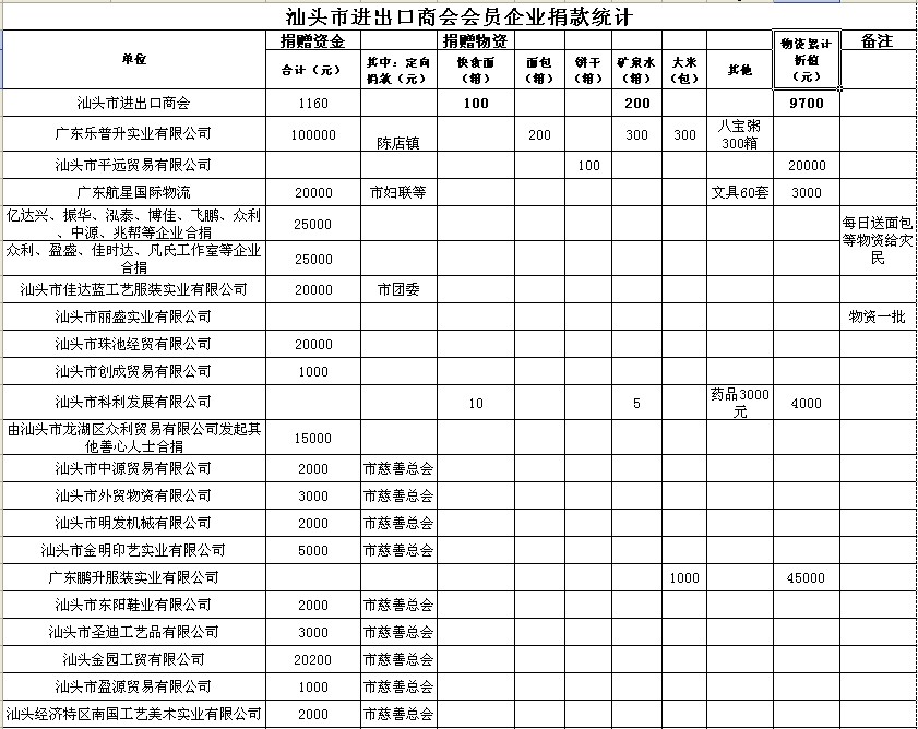为帮助灾区同胞重建家园,社会各界热心人士仍通过各种途径慷慨解囊,无私奉献。截至30日下午,商会会员企业为灾区捐赠的善款累计330541.2元,捐赠物资市值累计约81700元,以实际行动支援灾区抗灾复产。具体捐赠见附表: