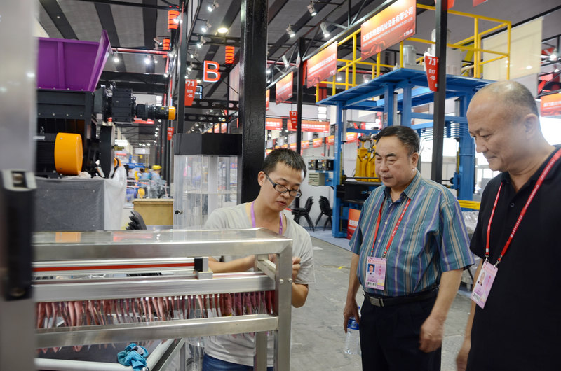 企业工作人员向市外经贸局纪检组长田建忠介绍摊位情况