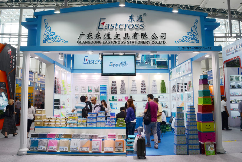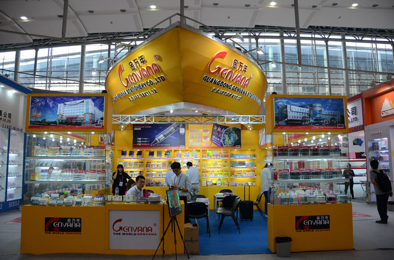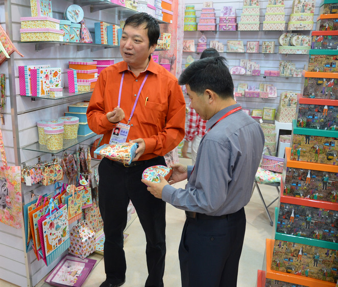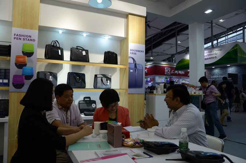 广东华隆文具有限公司许木营副会长在展位与外商洽谈中