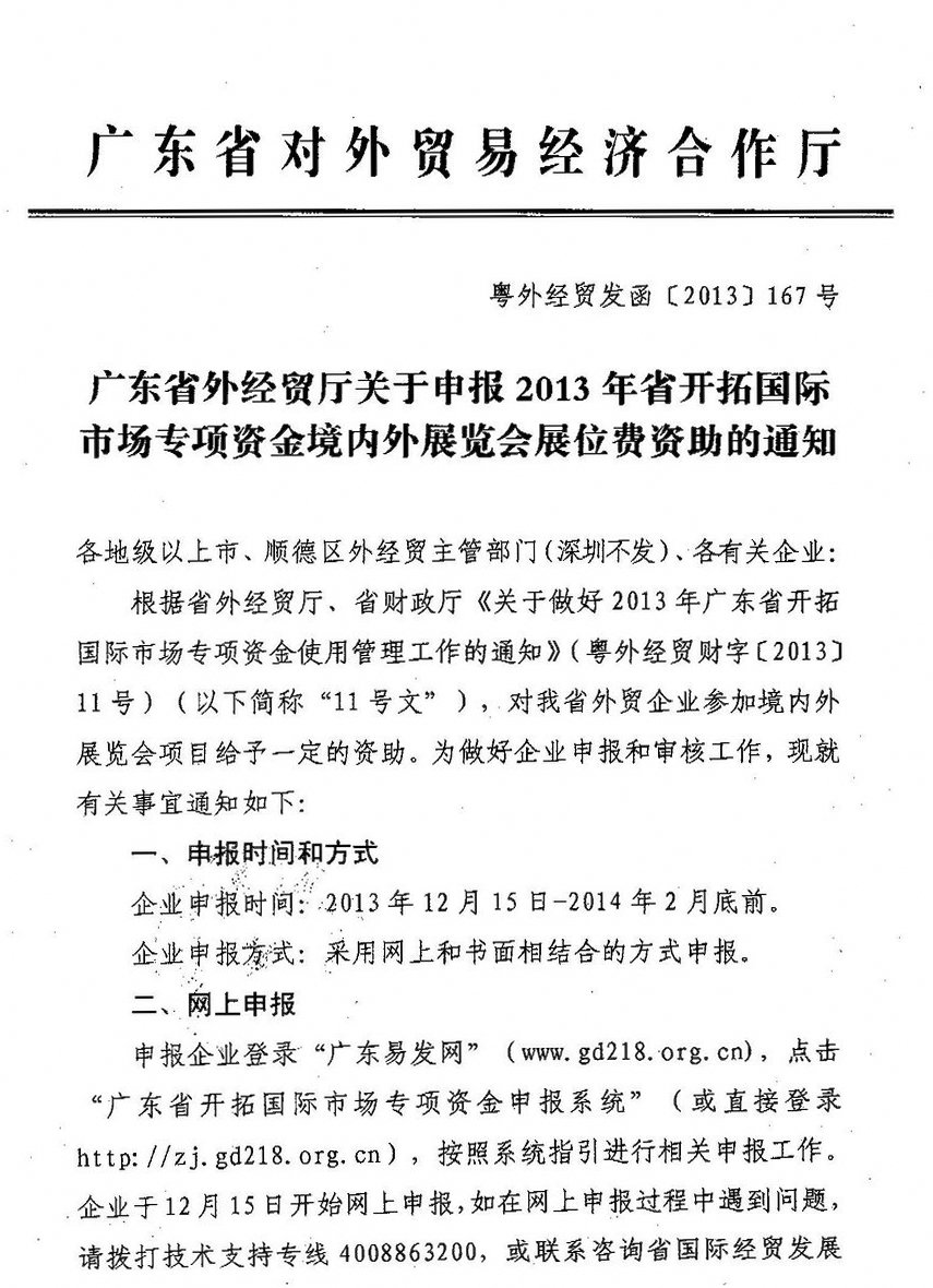 广东省外经贸关于申报2013年省开拓国际市场专项资金境内外展览会展位费资助的通知