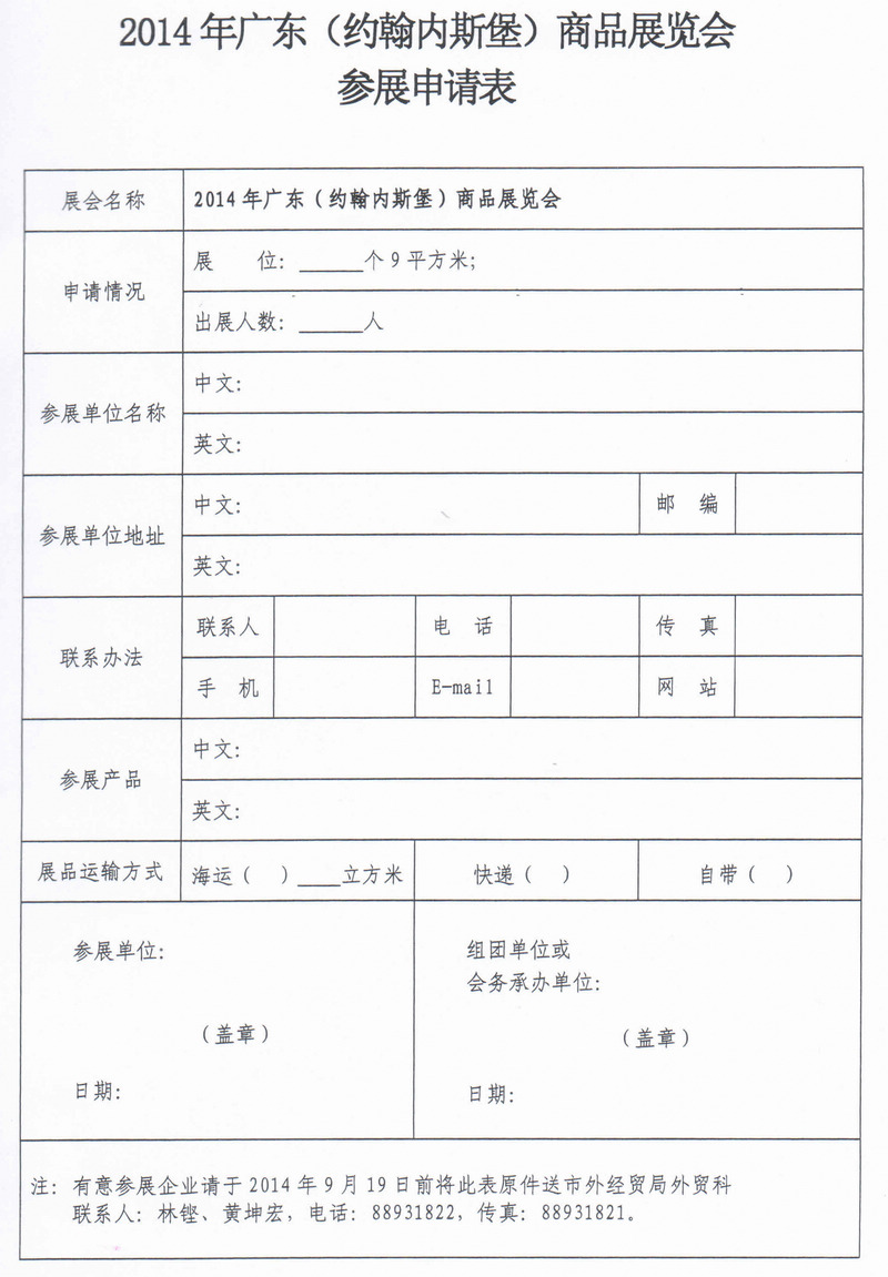 附件:《2014年广东(约翰内斯堡)商品展览会参展申请表》
