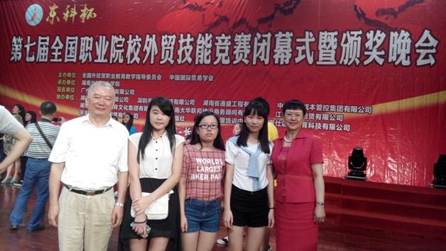 2014年7月16—19日在湖南长沙举行的“东科杯”第七届全国职业院校外贸技能竞赛中,我校学生再次取得优异成绩,欧阳泽君荣获中职组外贸技能竞赛个人一等奖、陈丹婷荣获斯坦福商务英语技能竞赛个人三等奖,学校参赛团队荣获优胜奖,这是自2008年以来我校学生连续七年在“全国职业院校学生外贸技能竞赛”中获得个人外贸单证技能竞赛一等奖的好成绩,也进一步证明我校在实践性技能教学方面的教学改革成果,在全国职业院校中产生积极的反响。