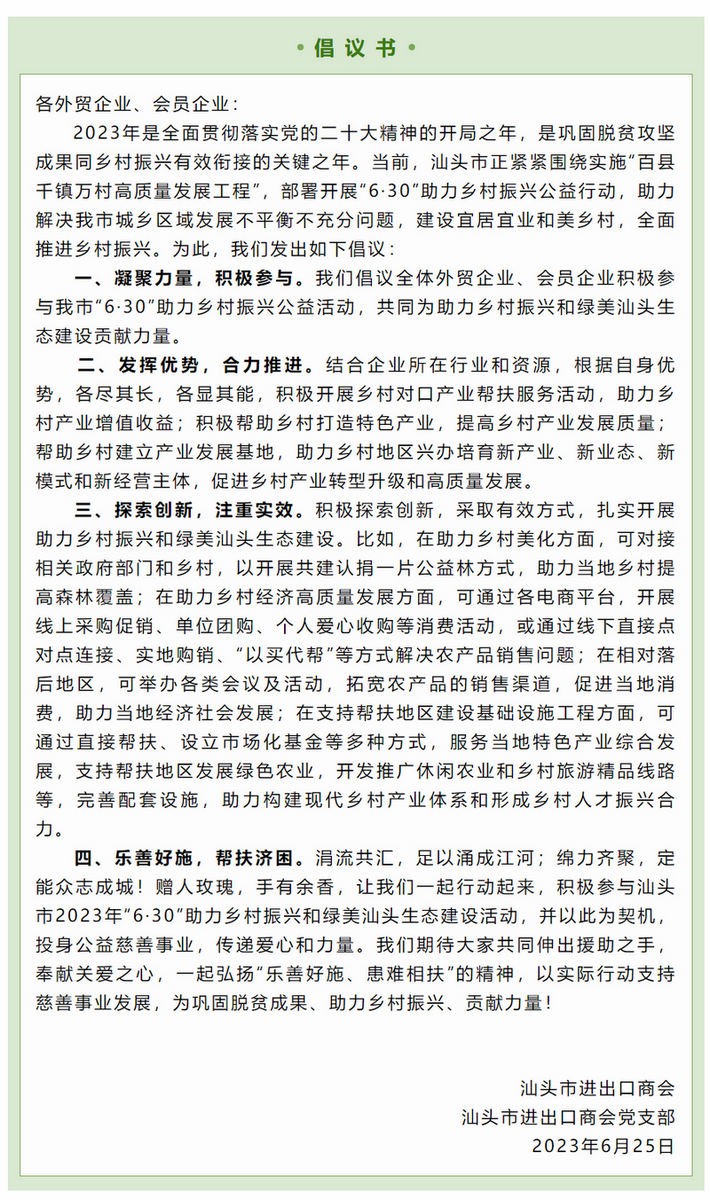 汕头市进出口商会关于“6·30” 助力乡村振兴和绿美汕头生态建设倡议书