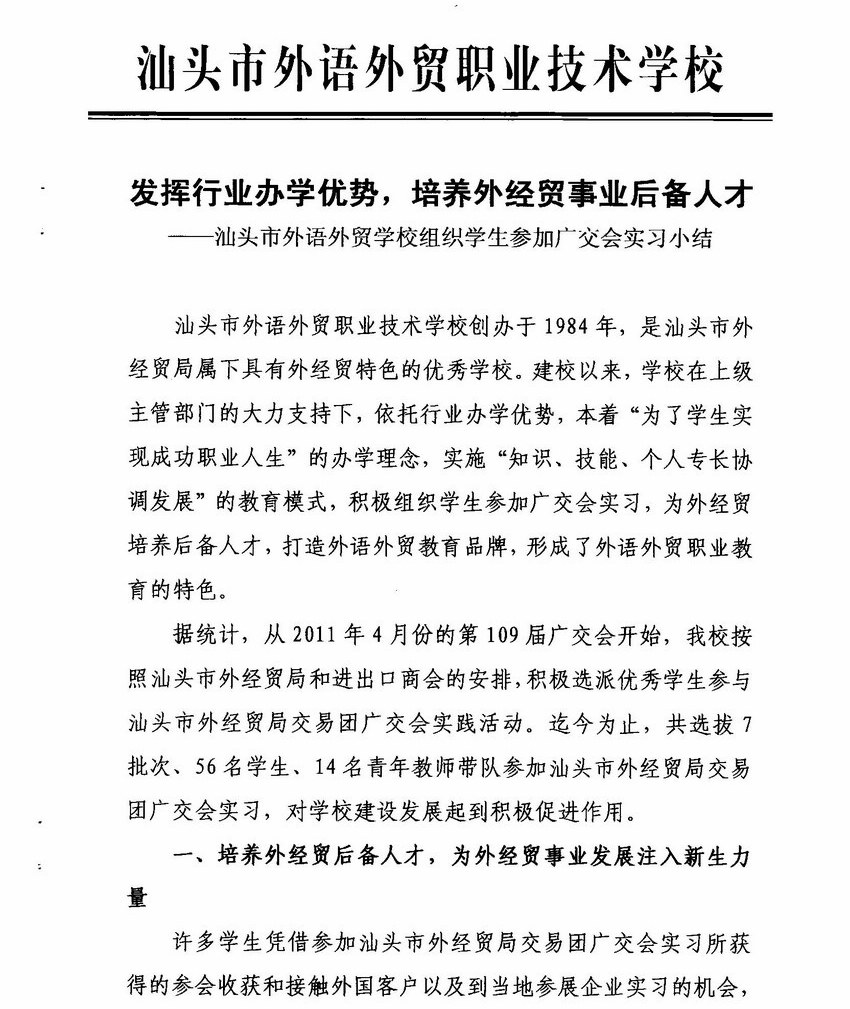 汕头市外语外贸学校组织学生参加广交会实习小结