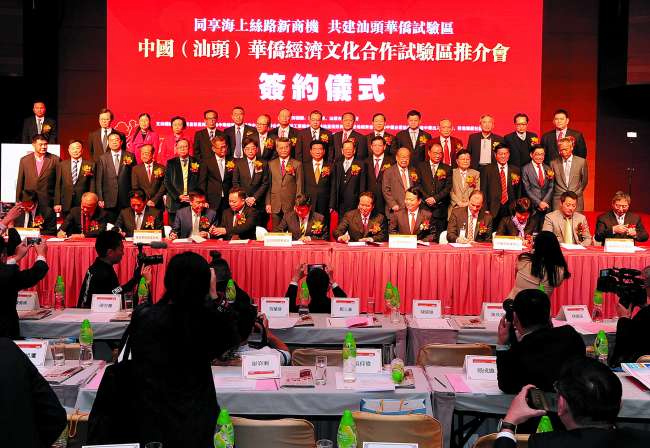 “同享海上丝路新商机,共建汕头华侨试验区。”昨天下午,由市委、市政府主办的中国(汕头)华侨经济文化合作试验区推介会在香港会展中心举行,这是国务院批准在汕头设立华侨试验区之后,汕头首次到香港招商推介。推介会共有签约项目64个,累计投资总额1588.55亿元人民币,其中上台签约项目32个,投资总额达1116.62亿元人民币。市委书记陈茂辉在致辞中表示,华侨试验区的设立,让汕头站到了新一轮改革开放最前沿,在建设21世纪海上丝绸之路的新形势下,汕头经济特区将积极先行先试,为新时期全面深化改革、扩大对外开放探索新路,希望广大海外华侨华人和众多潮籍乡亲乡贤热情参与、大力支持华侨试验区的建设发展。
