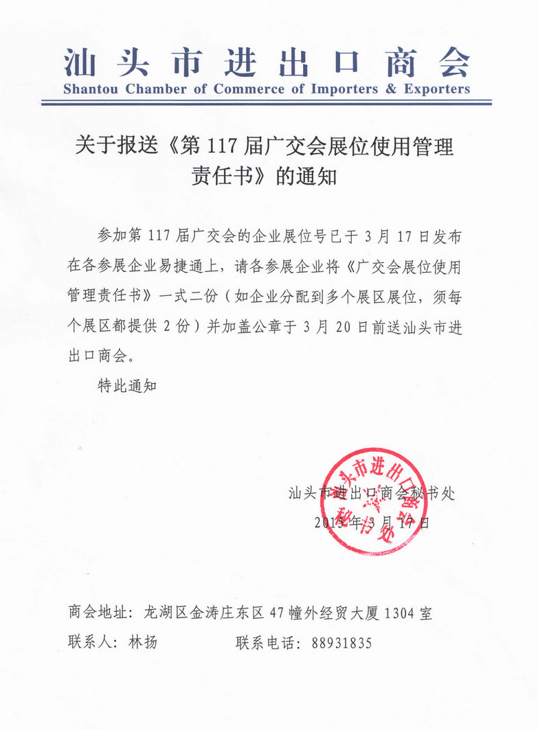关于报送《第117届广交会展位使用管理责任书》的通知