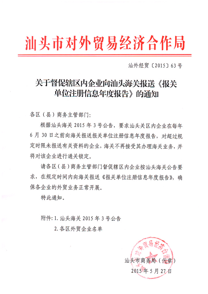关于督促辖区内企业向汕头海关报送《报关单位注册信息年度报告》的通知