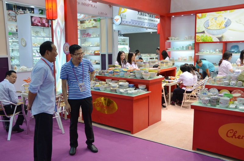 听取副会长、汕头市皓业青花彩瓷股份有限公司总经理郑秋荣介绍参展成交情况