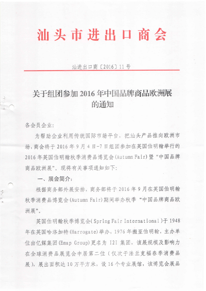 关于组团参加2016年中国品牌欧洲展的通知