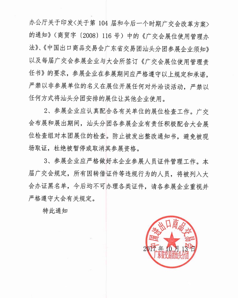 关于第122届严格遵守广交会展位使用等有关规定的通知