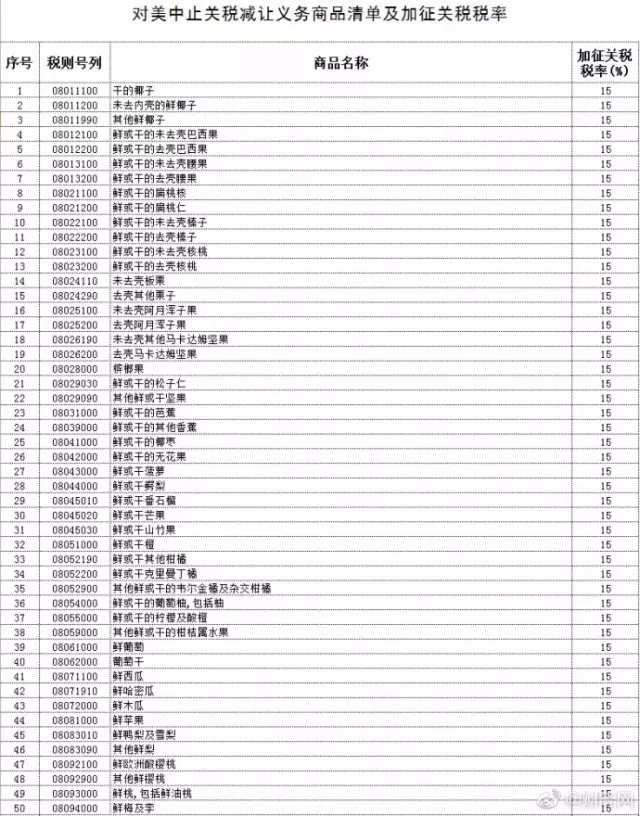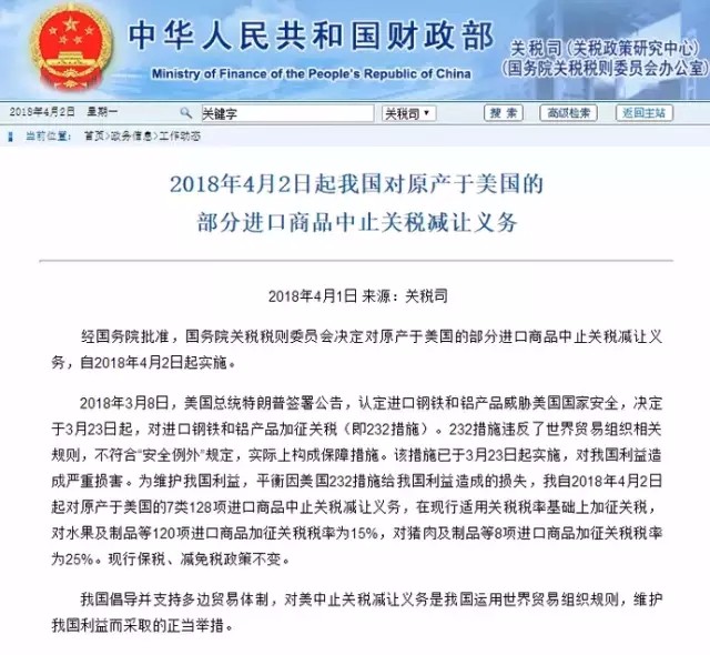 经国务院批准,国务院关税税则委员会决定对原产于美国的部分进口商品中止关税减让义务,自2018年4月2日起实施。
