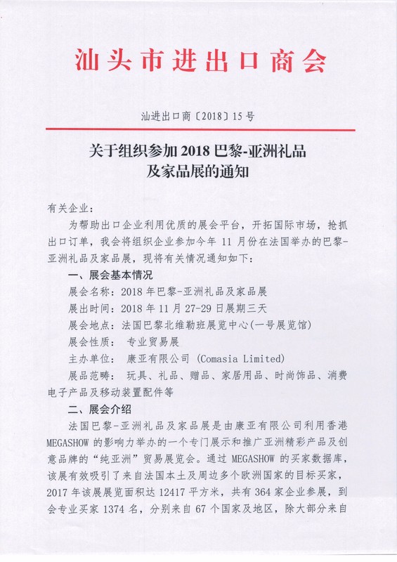 关于组织参加2018巴黎-亚洲礼品及家品展的通知