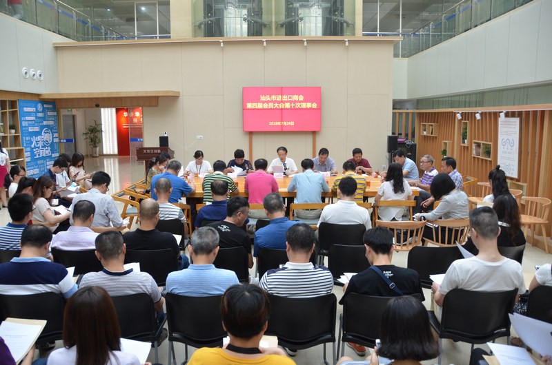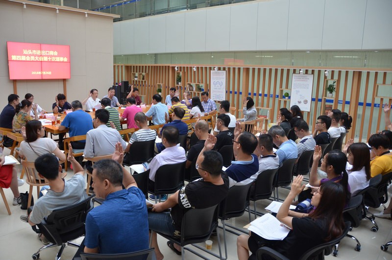 2018年7月26日下午,汕头市进出口商会在航天卫星大厦4楼召开第四届会员大会第十次理事会,共有56位理事代表参加会议。
