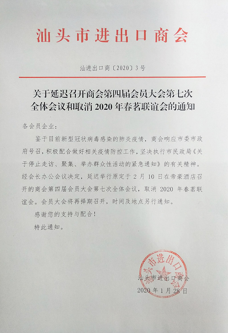关于延迟召开商会第四届会员大会第七次全体会议和取消2020年春茗联谊会的通知