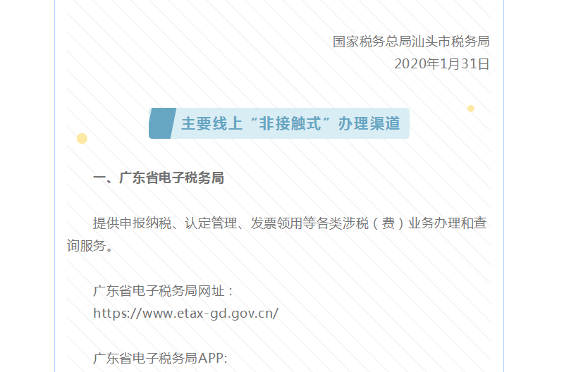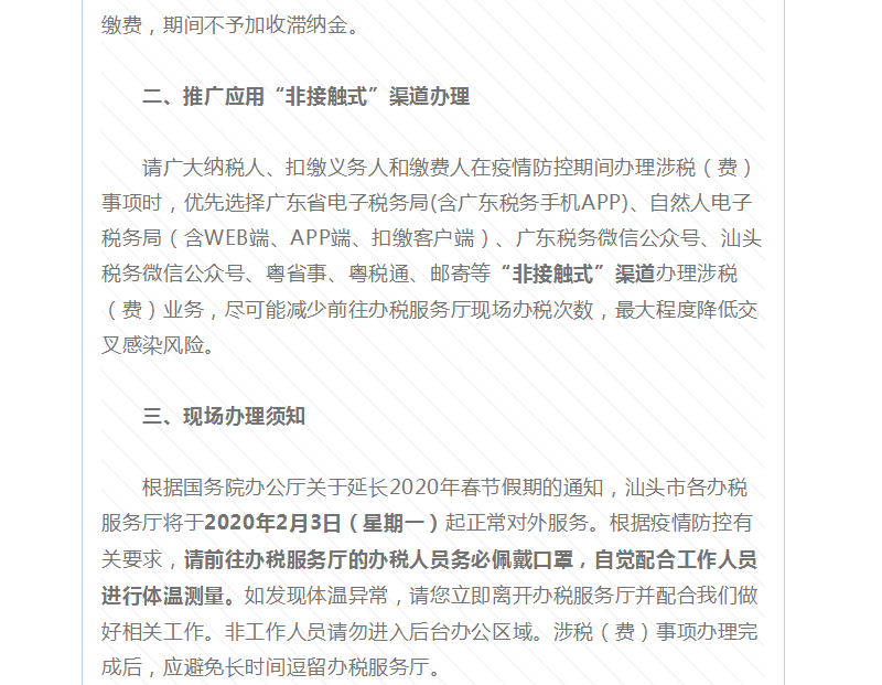 国家税务总局汕头市税务局关于延长2月份申报期及防范新型冠状病毒传播相关事宜的办税(费)温馨提示