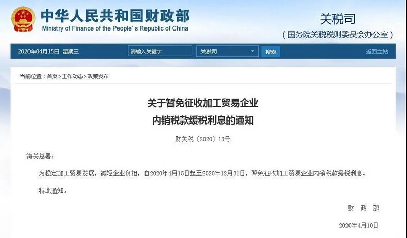 为稳定加工贸易发展,减轻企业负担,自2020年4月15日起至2020年12月31日,暂免征收加工贸易企业内销税款缓税利息。
