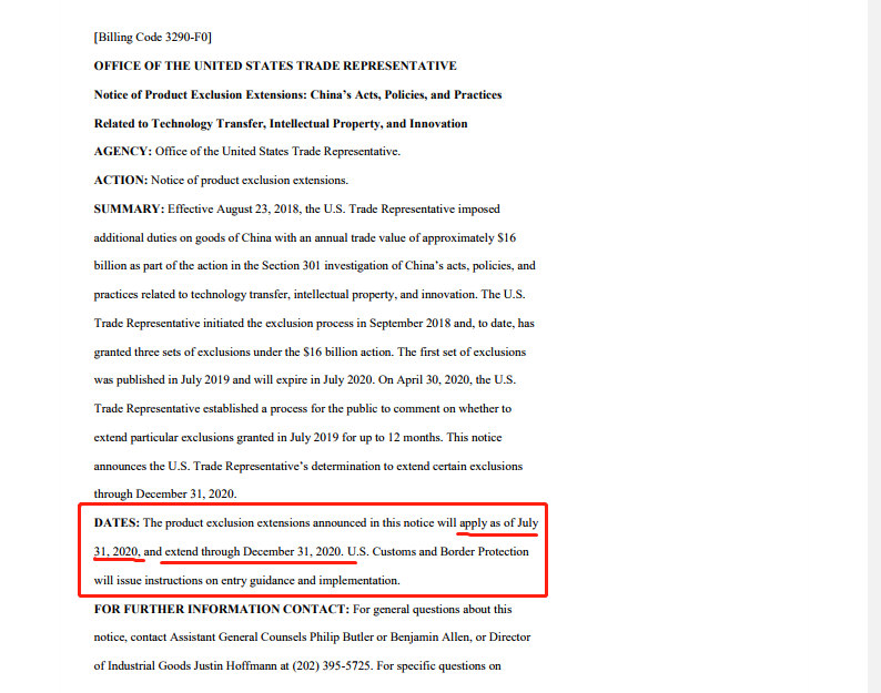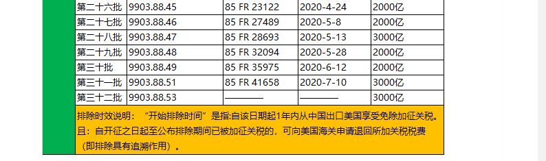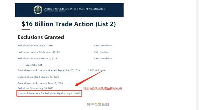 7月27日,美贸易代表办公室(USTR)又公布了针对160亿美元中国产品加征关税(List 2)于2019年7月31日第7批排除清单加征有效期延长公告。