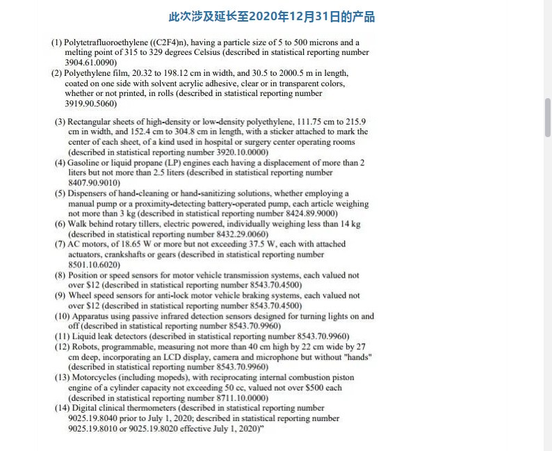 本次公告决定,将部分商品的排除有效期延长至2020年12月31日,55个品项商品7月31日起恢复加征25%关税。