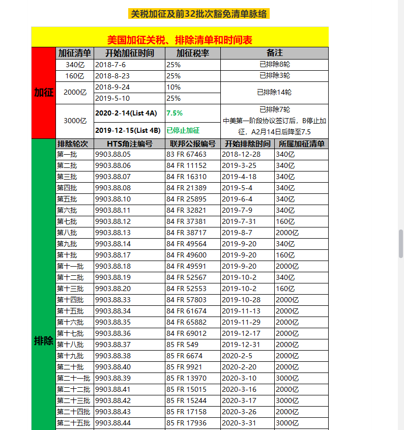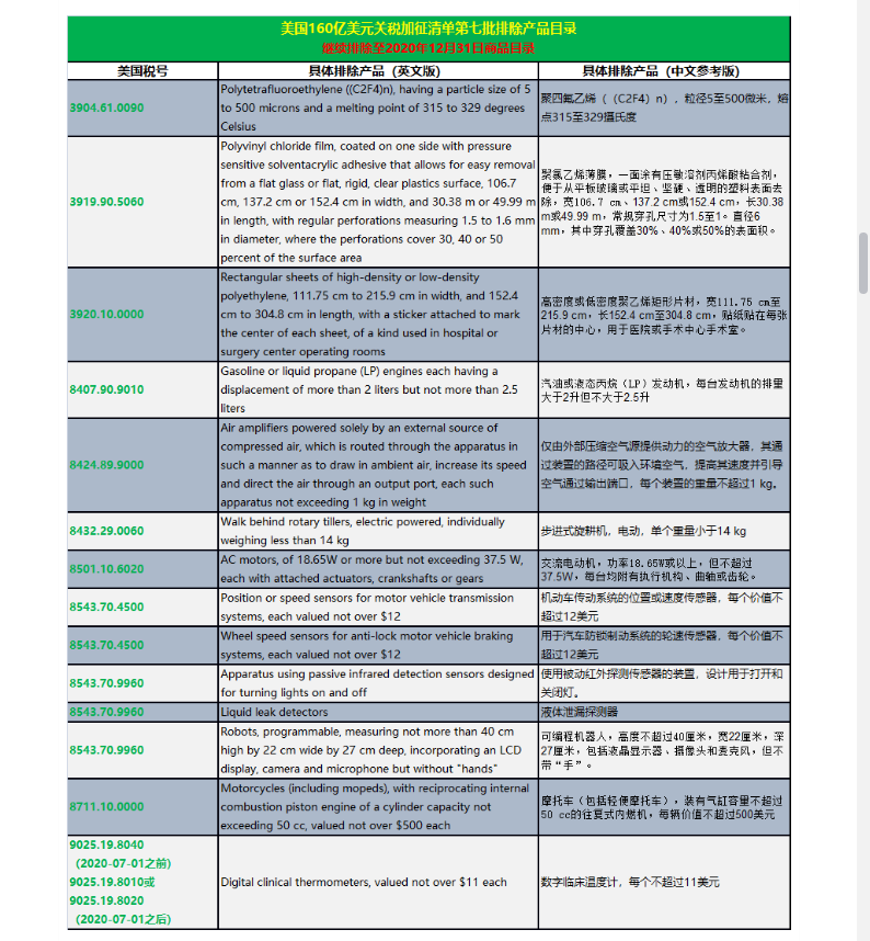 2019年7月31日针对160亿第七次排除清单共涉及34个税号69个品项的商品。此次未获得延长有效期的包括28个税号下55个品项的商品,将于2020年7月31日到期后,被移出排除清单。即2018年8月23日至2020年7月31日期间,这些商品可免加征关税,但从2020年7月31日起,恢复额外加征关税25%。(名单见列表2)